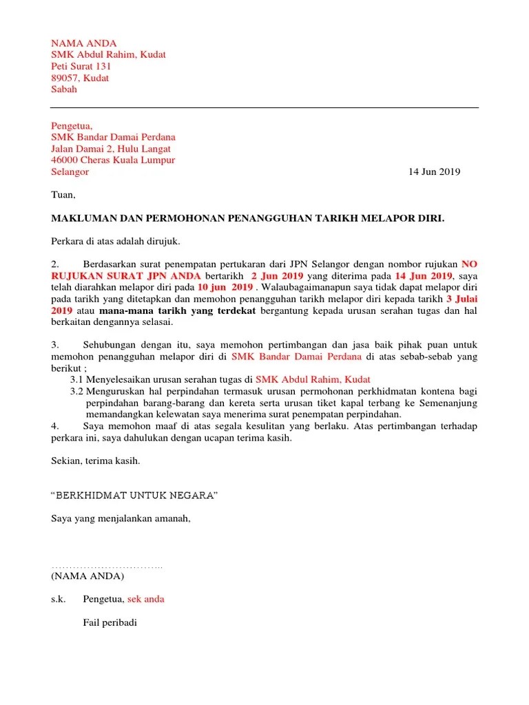 Surat rasmi lewat lapor diri surat r. (kepada ketua jabatan yang baharu). Tangguh contoh surat penangguhan kerja.
